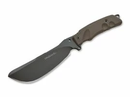 Als Outdoormesser, Survivalmesser, Bush- oder Campknife setzt das Parang Maßstäbe. Die breite Klinge aus N690 sorgt mit ihrer Vorderlastigkeit für ausgezeichnete Hau- und Hackeigenschaften. Die weit vorgesetzte Zeigefingermulde ermöglicht in Kombination mit der Riffelung auf dem Klingenrücken einen kurzen, kraftvollen Griff und erleichtert damit viele Arbeiten. Durch die weit hochgezogene Klingenspitze lässt sich das Parang auch als Skinner einsetzen. Der bewährte Forprene-Griff zeichnet sich durch Griffsicherheit und Ergonomie aus. Mehrere Ösen ermöglichen eine Befestigung des Messers an einem Stock o.ä.. MOLLE-kompatible Cordurascheide mit zusätzlichen Schlaufen zur Anbringung weiteren MOLLE-kompatiblen Zubehörs wie z.B. dem beiliegenden Survival-Kit. Der stabile Alubehälter enthält unzählige Gegenstände für den Einsatz in den verschiedensten Situationen, bis hin zu Kondom und Knicklicht für Spontanparties in der Wildnis, und kommt mit einer separaten, MOLLE-kompatiblen Corduratasche.Technische DatenGesamtlänge: 31 cmKlingenlänge: 17.9 cmKlingenstärke: 6 mmGewicht: 339 GrammKlingenmaterial: N690Griffmaterial: Forprene