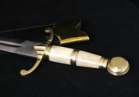 Guinegate Dolch Kaiser Maximilians I., mit Scheide Dies ist der passende Dolch zu dem berühmten Schwert, welches Kaiser Maximilian I. in der Schlacht bei Guinegate 1513 getragen haben soll. Aufgrund der Tatsache, dass die französische Reiterei ungeordnet und fluchtartig das Schlachtfeld verließ, ist diese Schlacht auch unter dem Namen Sporenschlacht bekannt.Unsere Nachbildung hat einen schönen Knochengriff. Griffringe, Knauf und das markante Parier sind aus massivem Messing. Der Dolch kommt mit einer Lederscheide mit Mund- und Ortblechen ebenfalls aus Messing.Details:Material: Karbonstahlklinge, Griff aus Knochen und MessingGesamtlänge: ca. 43,4 cmKlingenlänge: ca. 28,5 cmGewicht (mit Scheide): ca. 650 gInklusive einer passenden Lederscheide mit Gürtelschlaufe (für max. ca. 6 cm breite Gürtel)Separat erhältlich: das Guinegate Schwert Maximilians I., Artikelnr. 0116336800Bitte beachte: Der Verkauf dieses Artikels erfolgt nur an Personen über 18 Jahre. Bitte gib deshalb Dein Geburtsdatum in unserem Bestellformular an. Zusätzlich benötigen wir eine Kopie Deines Personalausweises/Führerschein o.ä. per E-Mail, Scan, Fax oder Post.