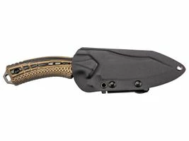 Das kräftige Gürtelmesser aus der TOP-Collection Serie von Herbertz punktet mit einem ungewöhnlich auffälligen Klingendesign mit Teilsägezahnung. Zahlreiche Mulden im Griff und auch auf der Klingenoberseite erlauben unterschiedlichste Handhaltungen beim Arbeiten mit dem Messer. Für die Fulltang-Klinge wurde titanbeschichteter, rostfreier Edelstahl 440 verarbeitet, als Griffbeschalung kam mehrfarbiges G10 zum Einsatz. Eine robuste Kydex-Scheide ist im Lieferumfang enthalten.